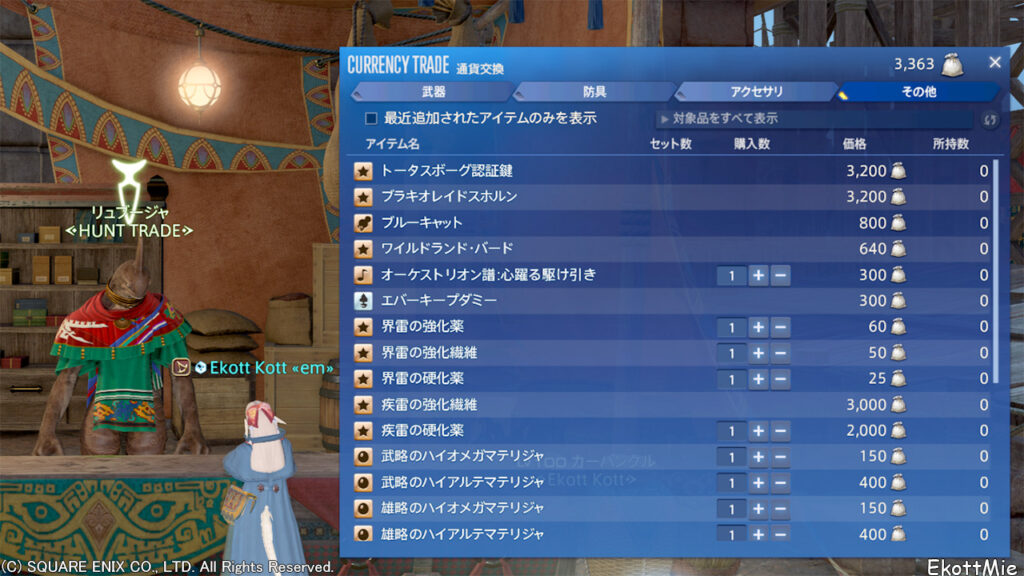 トライヨラのモブハント交換NPCリュブージャよりモブハン戦利品3200と交換で入手できます。